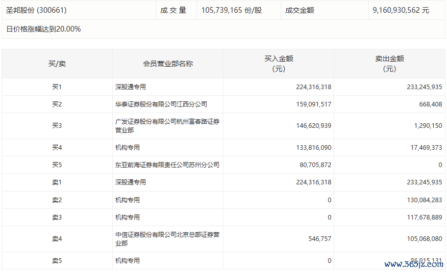 0 09-16 16:30圣邦股份本日20cm涨停,有3家机构专用席位净卖出3.35亿元