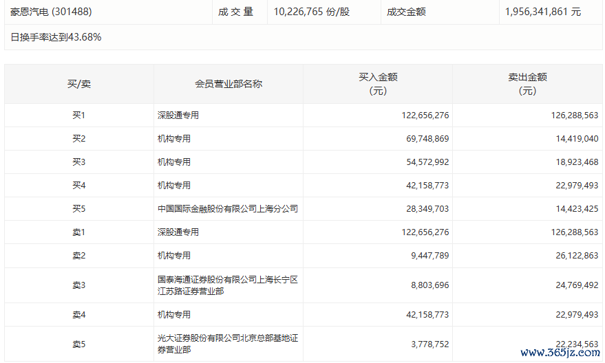 豪恩汽电本日涨14.22%,成交额22.19亿元,换手率46.21%,盘后龙虎榜数据显现,深股通专用席位买入1.68亿元并卖出1.29亿元,2家机构专用席位净买入1.11亿元,有1家机构专用席位净卖出1452.72万元。