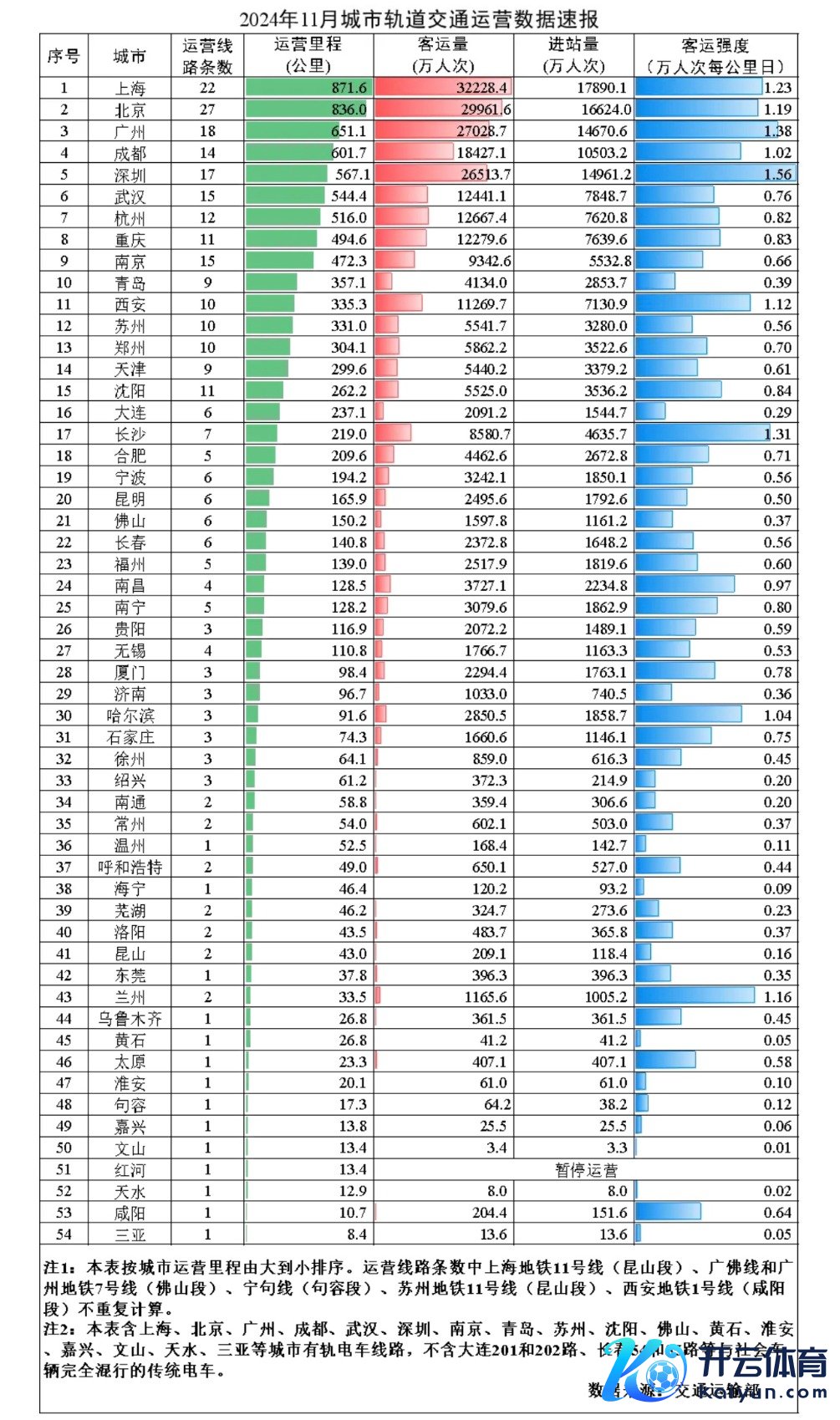 阐明交通运输部《2024年11月城市轨说念交通运营数据速报》,31个省(自治区、直辖市)和新疆分娩成就兵团共有54个城市怒放运营城市轨说念交通透露313条,运营里程10522.1公里,完成客运量27.1亿东说念主次。11月份宇宙总运营里程的平均客运强度为0.860万东说念主次每公里日,同比增长1.9%。