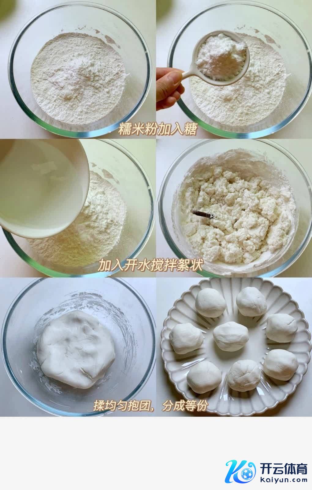 2. 糯米粉中加适量温水,揉成光滑不粘手的面团,分红6个大小均匀的小剂子。