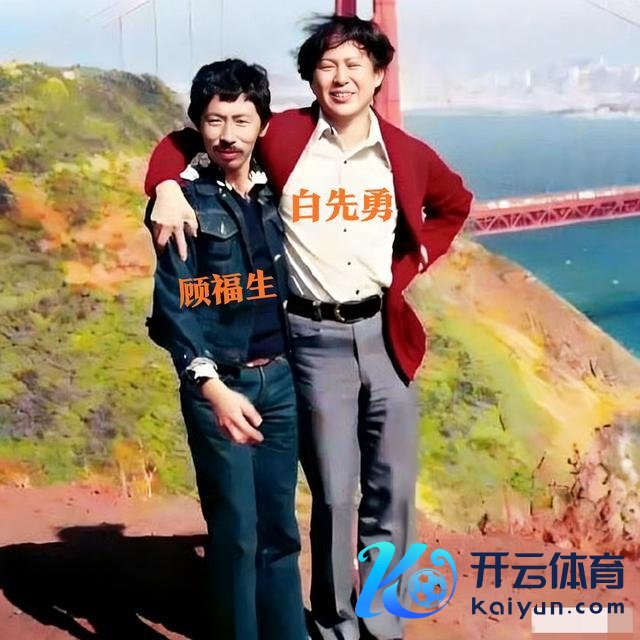 像片里的顾福生穿戴一身牛仔工装,留着标志性的小胡子,激情千里稳又带着几分艺术家的不羁;身旁的白先勇则披着酒红色开衫,笑颜轩敞,手臂当然搭在顾福生的肩头,两东谈主牢牢依偎,全然不见父辈的政事隔膜,只留住知音间的亲密与领路。