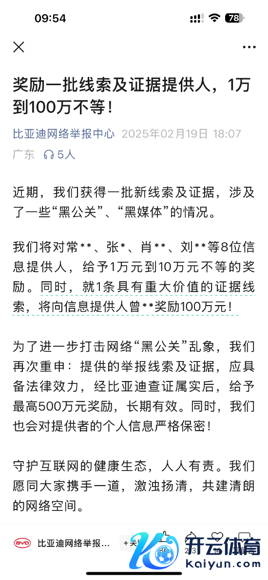 新浪科技讯 2月20日上昼音尘开yun体育网,2月19日,比亚迪集聚举报中心官号发文称,近期得回一批新陈迹及笔据,波及了一些“黑公关”、“黑媒体”的情况。咱们将对常某等8位信息提供东谈主赐与1万元到10万元不等的奖励。同期,就1条具有首要价值的笔据陈迹,将向信息提供东谈主曾某奖励100万元。