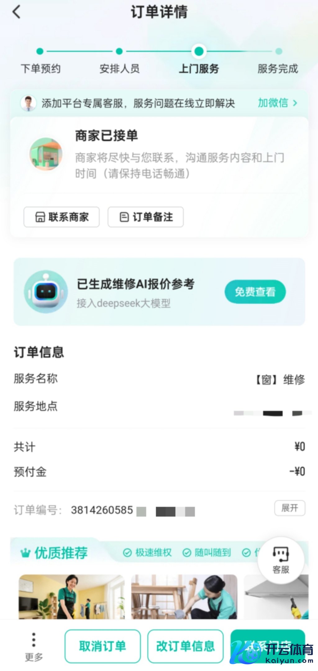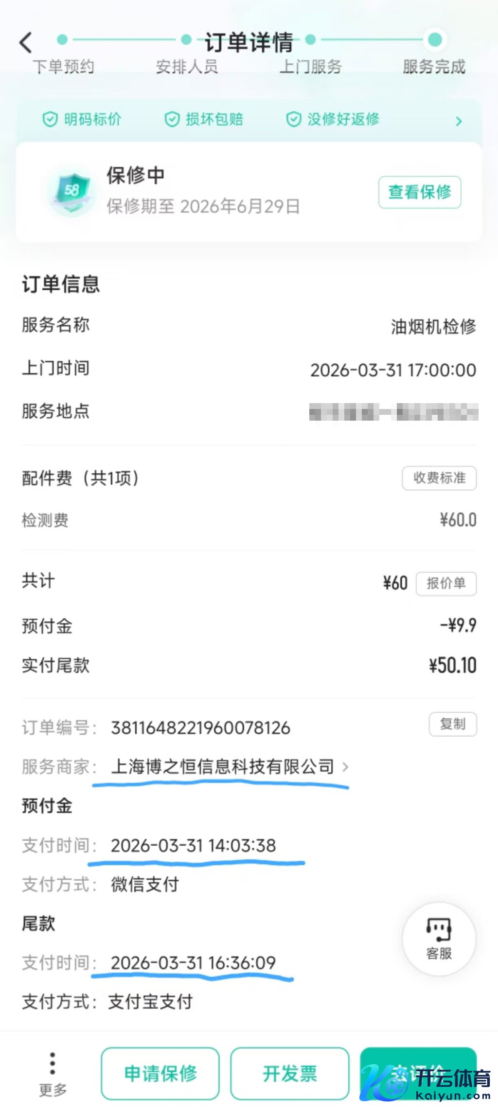 沈女士告诉记者,3月31日下昼2点多,他在58同城APP下单,给住在闵行区的父母维修油烟机,在平台上“磋议报价”后,她下了个订单。在她账号“我的订单”中,该订单的事业商家为:上海博之恒信息科技有限公司,检测费约60元,预支款9.9元。