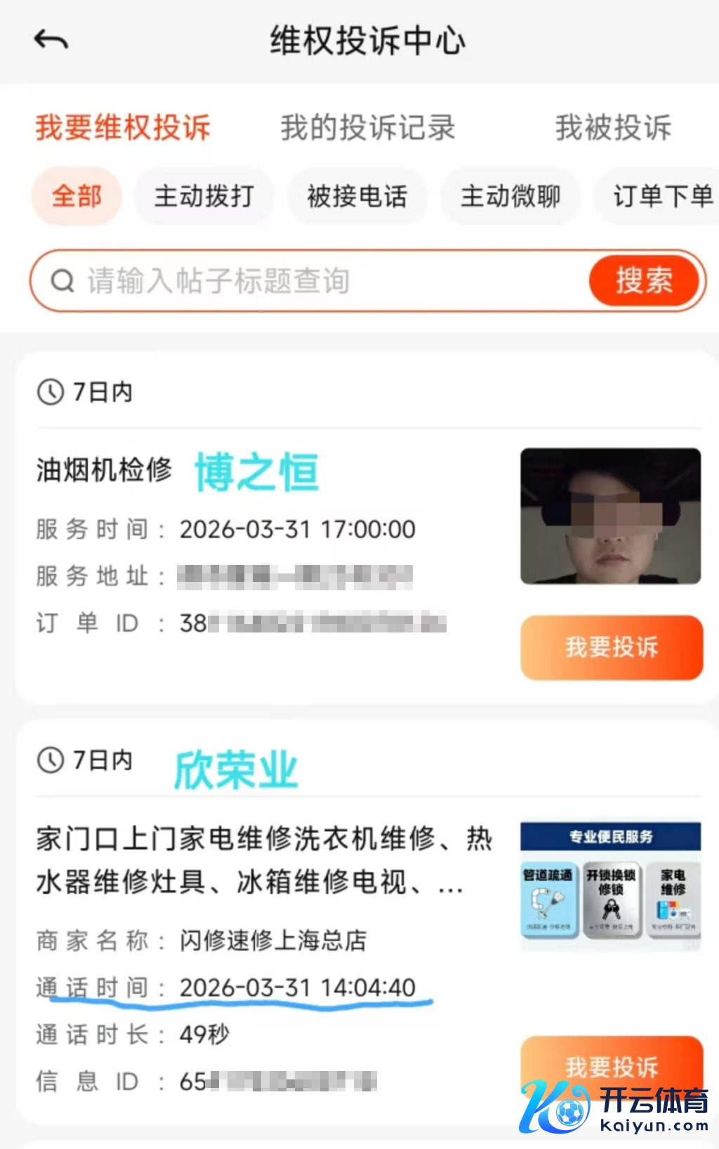 于是,沈女士向58同城的客服反应了此事。她称,客服提议她,先通过平台的维权通说念投诉。她在平台的“维权投诉中心”找到3月31日的订单,居然发现存两个订单,其中一个派给了“博之恒”,另一个订单派给了“闪修速修上海总店”,订单细目夸耀,该店的商家系“上海欣荣业家电维修有限公司”。