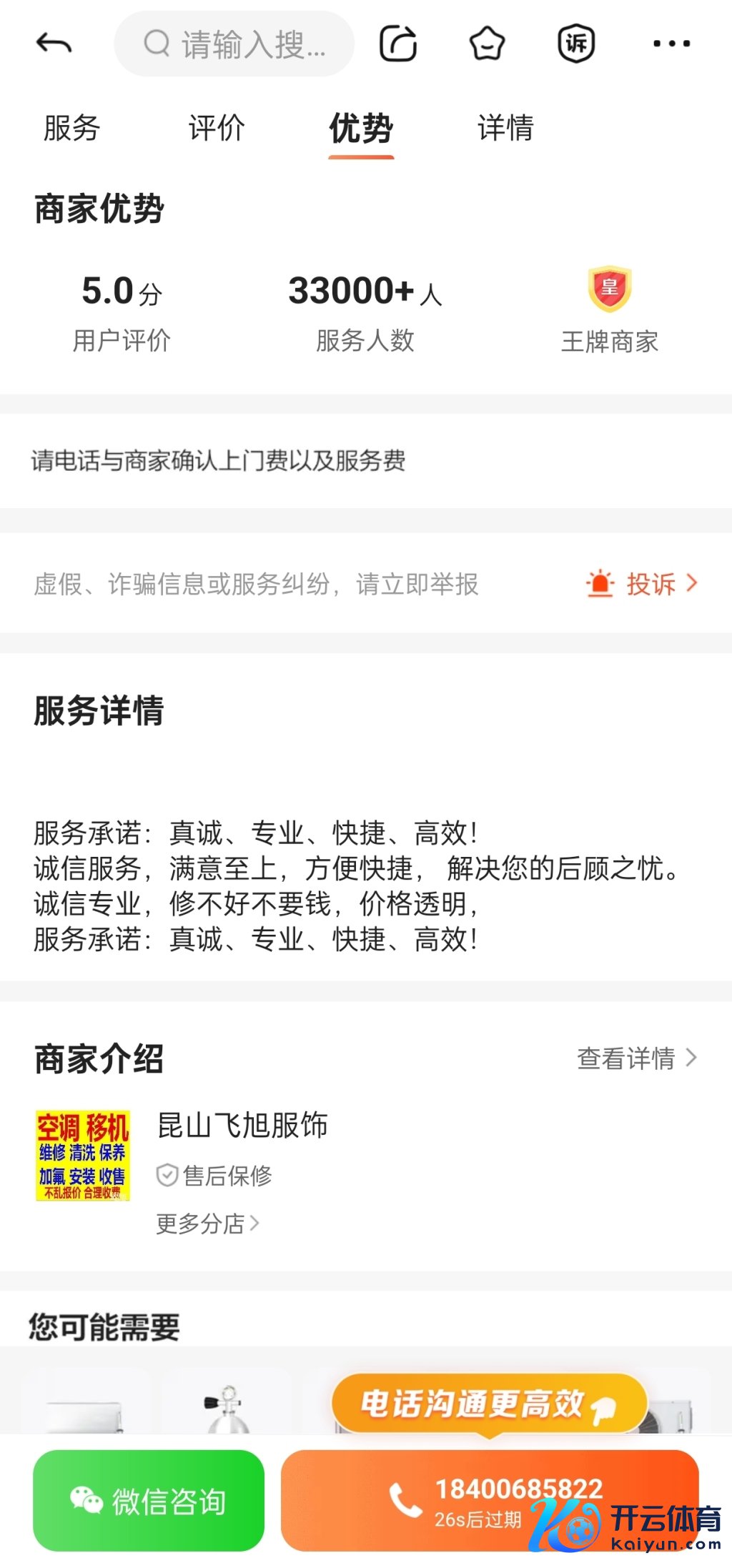 58同城上对于“昆山飞旭衣饰”的信息夸耀,该商家主营空调维修,雪柜维修、冷库维修等,面前“事业累计千次”,店铺为五星店,有3.3万东说念主守护过店铺,是平台的王牌商家。